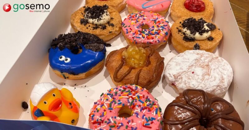 This morning, Gigsby was spotted diving beak-first into a box of donuts because apparently, fiber speed isn’t the only thing on the menu!