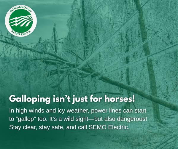 In high winds and icy weather, power lines can start to “gallop” too. It’s a wild sight—but also dangerous! Stay clear, stay safe and call SEMO Electric so our team can rope those lines back in.